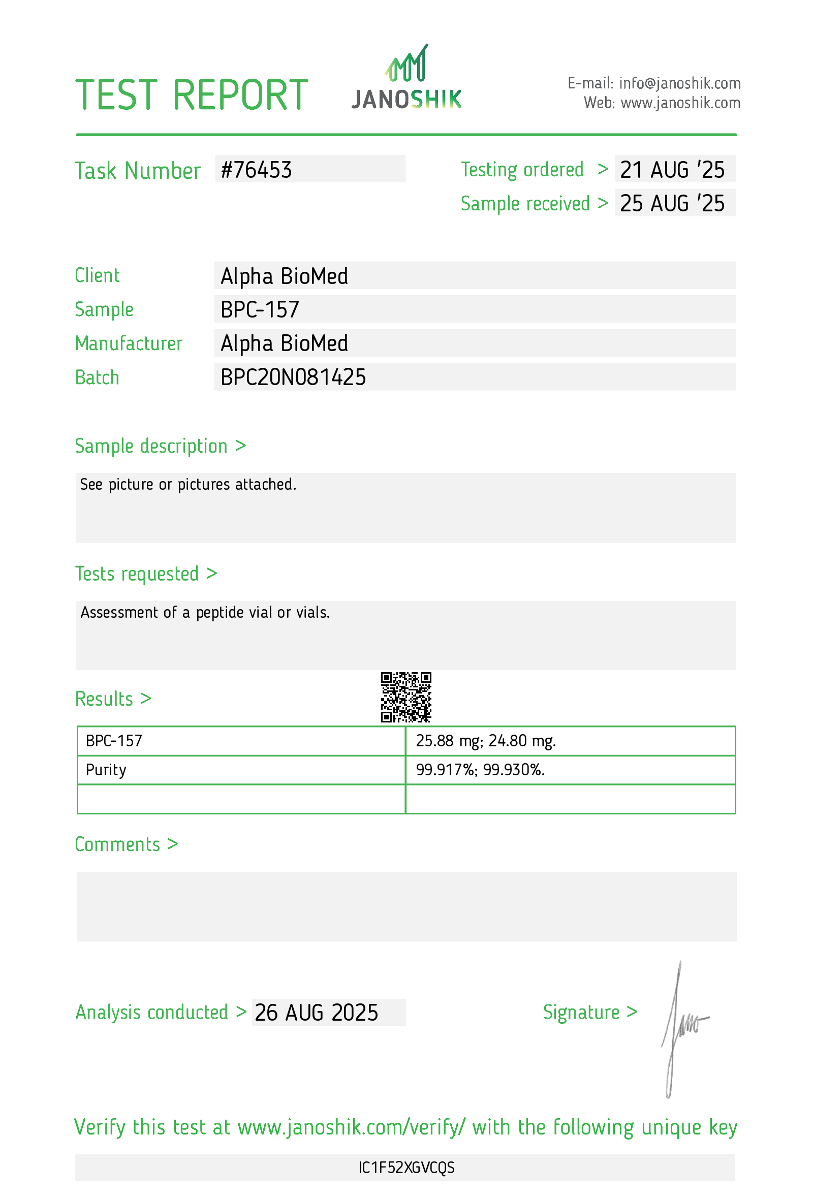 Issued under Alpha Bio Med Labs, the authorized testing and distribution partner.