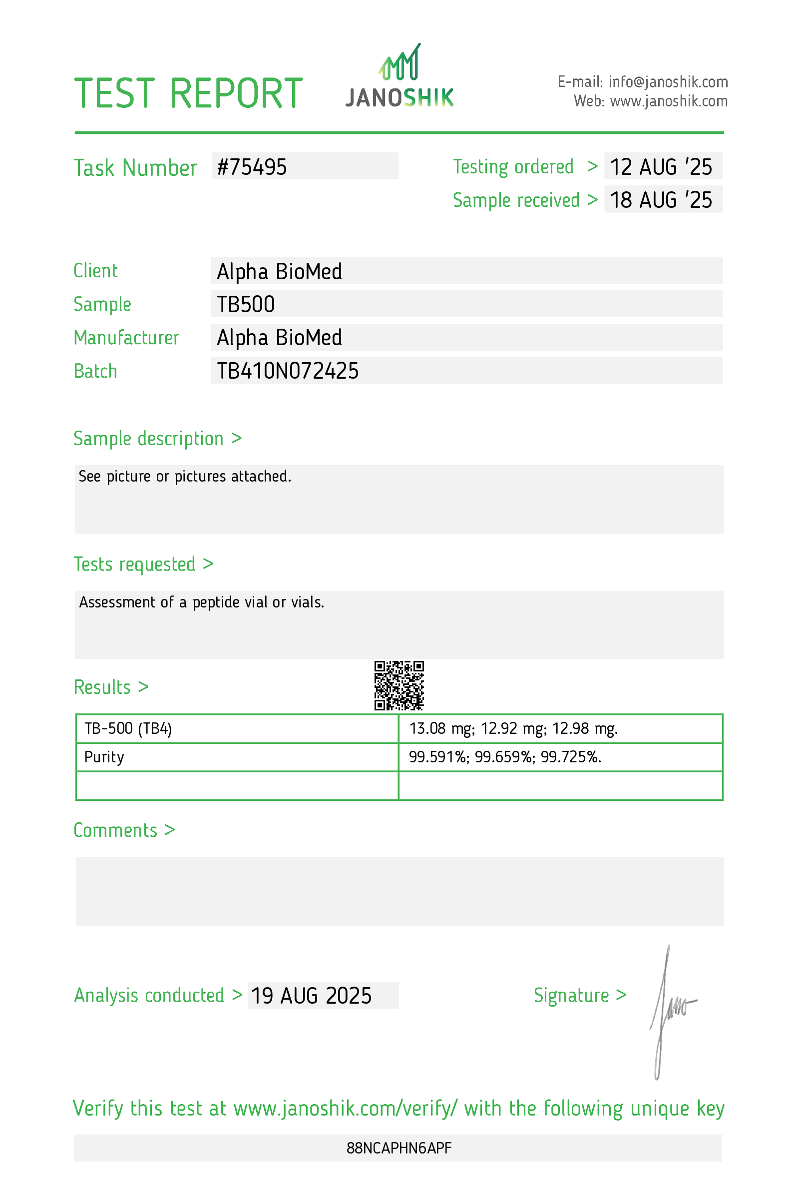 Issued under Alpha Bio Med Labs, the authorized testing and distribution partner.